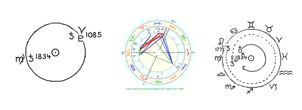 Veamos si podemos hacer esto más manejable aprovechando el tiempo lunar. Sabemos que de una lunación a la siguiente pasan 29.458 días, y que en un año hay 12,37 lunaciones. Por tanto, debemos reducir los años solares a años lunares. Haeckel nació en 1834. En 1772 Saturno estaba en el lugar donde estuvo la Tierra en el momento de su nacimiento. De 1772 a 1834 hay una diferencia de 62 años que contienen 767 lunaciones como representación de los años solares. (Resten 767 años de 1834 y llegarán a 1067, en la vida de Gregorio).