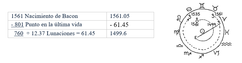 Esta vez tomaremos el año del nacimiento de Bacon en 1561. Tomaremos un punto en el tiempo, 801, de la última encarnación, y transpondremos estos años a lunaciones dividiéndolo por 12,37, y llegaremos a 61,45. Restamos 61,45 de 1561,05 y llegamos a la fecha de 1499 (agosto) cuando Saturno estaba en Aries en oposición a la Tierra en esa época.