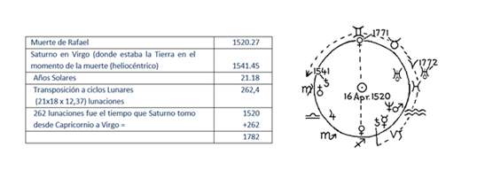 Su muerte tuvo lugar el 16 de abril de 1520. Urano estaba en Aries, Júpiter estaba en la constelación de libra, Saturno en Capricornio, la Tierra en Virgo, Venus en Sagitario, Mercurio en Capricornio, con Neptuno y Marte (heliocéntrica) en Acuario. Lo que tenemos que buscar es el momento en que Saturno entra en la misma posición que estaba la Tierra en la muerte. Saturno comienza en Capricornio y llega Virgo en 1541. Este sería el momento de Kamaloca —si lo hay en este caso particular. Ahora se procede: