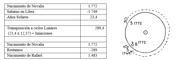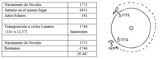 Saturno viajó alrededor del zodíaco varias veces antes de establecerse en el mismo lugar donde estaba la Tierra en el nacimiento de Novalis en 1772. Así llegamos al año 26 DC, refiriéndose a Juan el Bautista. Esto puede ser corroborado por la transposición de Saturno en el tiempo.