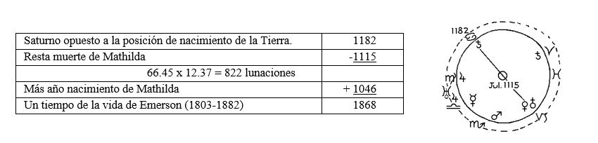 En realidad, no sabemos qué sucedió a menos que estudiemos su biografía, pero es posible que puedan descubrir esto como una fecha importante en su vida. Sin embargo, esto una vez más da alguna indicación de la relación del asterograma de la muerte con la encarnación futura. En esto ya existe la realización de posibilidades futuras. Toda la vida de Mathilda parece haber sido un trabajo hacia la encarnación de Emerson como una posibilidad. Hacemos muchas cosas en la vida y sabemos que influyen en nuestra encarnación futura. Pero cuando sea eso se decide con las Jerarquías Divinas después de la muerte.