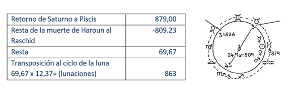 Ahora vamos a investigar a Harun al Raschid, que murió el 24 de marzo del año 809 (círculo interior). Júpiter y Saturno estaban en conjunción en Escorpio. El Sol estaba en Piscis, con Venus y Mercurio cerca, mientras que Marte estaba más atrás en Acuario. Ahora buscaremos una vez más el momento en el que Saturno vuelve a Piscis (2 ½ ciclos) en el año 879. Esto fue en el mismo lugar que el Sol estaba en la muerte, desde el punto de vista geocéntrico.