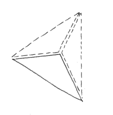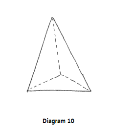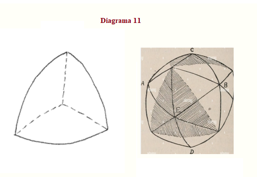 Ahora bien, en relación con esto quiero explicar algo de lo que se habla poco hoy, pero que sin embargo es cierto. Se oye decir en todas partes, que la Tierra es un globo, que se formo como un globo. ¡Pero en realidad no es cierto que la Tierra sea un globo! Voy a explicarles lo que es la Tierra en realidad. Que la Tierra es un globo es sólo fantasía. Si nos imaginamos la verdadera forma de la Tierra como un sólido regular, llegamos a lo que en ciencia se llama tetraedro. Voy a mostrar, aunque, naturalmente, sólo en la perspectiva. Un tetraedro se parece a esto. [Ver diagrama 10]
