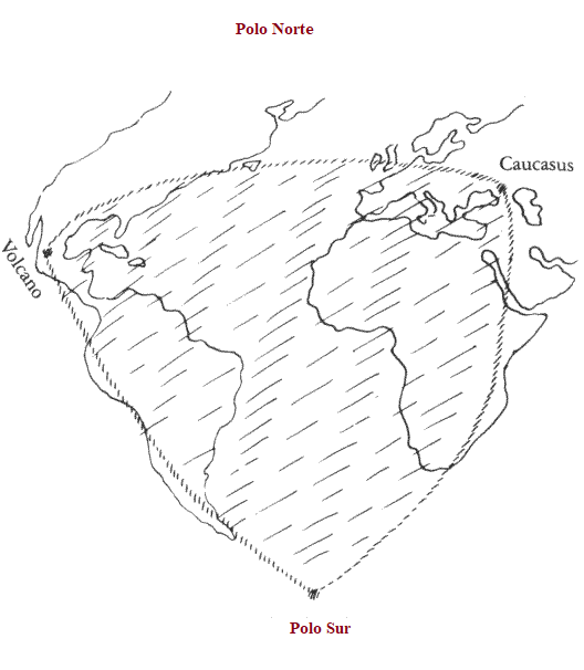 Si nos imaginamos la Tierra de esta manera, la vemos existir en el universo como una pirámide redondeada, que envía su ápice desde allí a Japón y tiene su base aquí, con África, América del Sur y el Océano Austral conjunto. Así que la Tierra se encuentra en el universo, curiosamente, como un tetraedro redondeado hacia fuera, como una especie de pirámide. Esa, señores, ¡en realidad sigue siendo la forma de la Tierra!