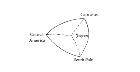 ¡Basta pensar, la base de un tetraedro! Ahora: ¿cómo llegamos a ese punto? Bueno, tenemos que pasar por el otro lado de la Tierra. Pero no se puede hacer eso, tendría que hacer todo de todo. Si tuviera que hacerlo todo, me gustaría llegar al punto un poco más allá en Japón. Así, si puedo marcar el tetraedro, aquí tenemos a América Central, aquí en el Polo Sur, aquí en el Cáucaso, y allá, que uno no puede ver, estaría Japón.