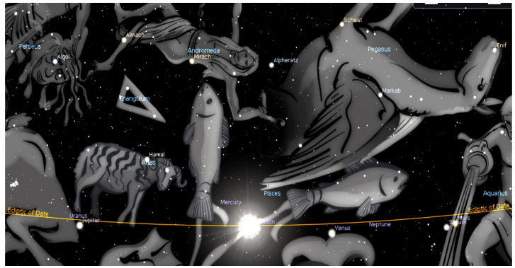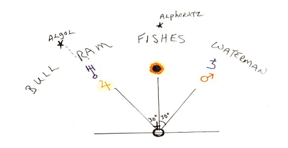 Ahora podemos trasladarnos al centro de esta configuración, el Sol, la imagen cósmica del YO SOY entrando en eclipse total. Explicaré más detalladamente el eclipse en sí en la Parte 2. Pero ahora veremos su ubicación como parte de este triple tema en los cielos, el contexto planetario más amplio del eclipse. El Sol está en la constelación de Piscis, los Peces, las estrellas de nuestra era cultural. Un pez nada hacia Aries, el pensamiento desarrollado a partir de la época grecorromana y la independencia de los dioses que nos trajo. El otro pez nada hacia Acuario, lo que presagia el futuro pensamiento etérico de la próxima era. Nos encontramos en nuestra época entre ambas, en la época que Rudolf Steiner describió una vez como la era en la que la humanidad aprende a valerse por sí misma. Hemos superado con creces el punto medio de nuestra era, astronómicamente (frente a culturalmente) a sólo unos cientos de años del comienzo de la sexta época. Estamos en plena transición de lo viejo a lo nuevo. Se debe hacer preparación. El Sol también se encuentra ese día debajo de la estrella del tercer ojo del Alma, Andrómeda, de donde surge la nueva inteligencia alada, Pegaso. Aquí nuevamente tenemos otra imagen asociada con el pensamiento y con el «ojo» de Júpiter, el chakra del tercer ojo con Urano, potencial para la iluminación, en el signo de Aries, están debajo de la estrella demoníaca, el ojo de la muerte de Medusa. El Sol y la Luna eclipsan bajo el ojo en la frente de Andrómeda.