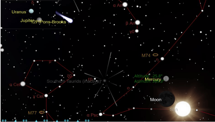 Arriba hay dos imágenes. El primero de Stellarium, un excelente software gratuito para rastrear los cielos, y el segundo del programa Planetarium del sitio web, TheSkyLive. El primero muestra los cielos llenos sobre el horizonte en el momento del eclipse, que se detallará a continuación. La segunda muestra una vista más pequeña del cielo, donde se puede ver la Luna nada más pasar por el Sol, y el cometa Pons-Brookes muy cerca de Júpiter y Urano, en su punto más cercano, su perihelio. Entonces, comencemos a explorar y, con suerte, tomar las partes para construir una imaginación cohesiva.