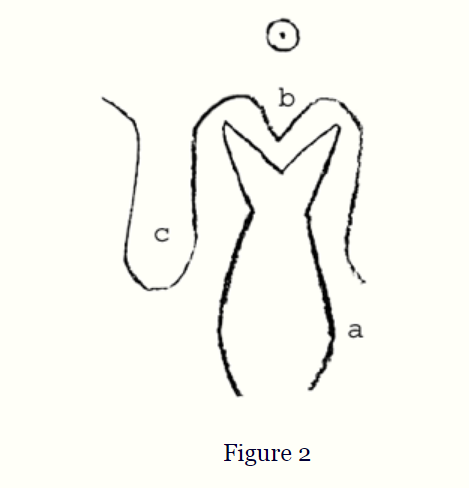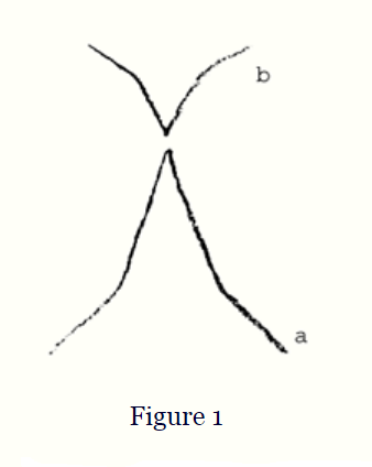 Mientras vivimos en una época en la que el Yo se está desarrollando, en la que la cultura basada en la razón externa está de moda y la filosofía externa tiene autoridad; lo que viene de arriba a los impulsos de los hombres en el mundo físico; de la guía y liderazgo del mundo espiritual; encuentra poca comprensión. Para despertar una idea de la dinámica, permítanme indicar mediante un esbozo cómo se ubican los hombres de la Quinta época post-atlante en todo el proceso evolutivo de la humanidad. Para indicarlo en unos pocos trazos, podemos elegir este motivo (una de las formas talladas del Edificio), que representa una fuerza que actúa desde abajo hacia arriba, e ilustra, como se puede sentir claramente, todos esos impulsos que el hombre lleva en la sangre; en los nervios, en el cuerpo etérico, en el cuerpo astral, y que se origina en las épocas precedentes, en realidad en la Primera época de cultura post-atlante. [Figura 1 (a)] Como un impulso que desciende desde arriba podemos indicar la fuerza que actúa hacia abajo desde el mundo espiritual hacia la intuición del individuo, pero con menos poder que el que el hombre lleva dentro de sí desde la antigüedad.
