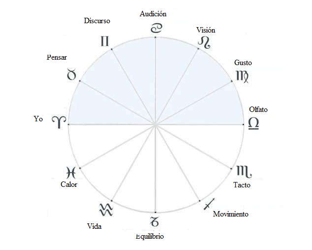 Naturalmente, el límite también es diagramático, hay una superposición —la realidad no siempre es acomodaticia. Pero este miembro del hombre de acuerdo a sus sentidos es tal que, incluso en el diagrama, sólo necesitas dibujar en lugar de los sentidos los signos del Zodíaco, y tienes Aries, Tauro, Géminis, Cáncer, Leo Virgo, Libra, Siete signos para el lado de la luz y cinco para la oscuridad: Escorpio, Sagitario, Capricornio, Acuario, Piscis; Aquí tienen un perfecto paralelo entre el hombre microcósmico, lo que se vuelve hacia sus sentidos y lo que se da vuelta, pero realmente se vuelve hacia los sentidos, y lo que en el cosmos significa el cambio del día a la noche. En cierto modo sucede lo mismo en el hombre, como en el edificio cósmico. En el edificio cósmico hay un intercambio entre el día y la noche, en el hombre hay también el intercambio del día y de la noche en su vigilia y su sueño, aunque ambos puedan haberse emancipado unos de otros para el presente ciclo de la conciencia humana. Durante el día el hombre se vuelve hacia sus sentidos de luz, o podríamos decir a Aries, Tauro, Géminis, Cáncer, Leo Virgo, Libra, como podríamos decir el sentido del yo, el sentido del pensamiento, el habla y así sucesivamente. Cada yo puede ver el yo del otro hombre, ustedes pueden entender los pensamientos de otro hombre, ustedes pueden oír, ver, saborear, oler —esos son los sentidos del día. En la noche pasa lo mismo con el hombre como con el giro de la Tierra; El hombre se convierte en la noche a sus otros sentidos, sólo que éstos todavía no están completamente desarrollados. Hasta la etapa de Venus no estarán tan desarrollados como para poder percibir lo que está en el otro lado. Todavía no están suficientemente desarrollados para percibir lo que es hacia el otro lado. Esto está envuelto por la noche al igual que la tierra está envuelta al pasar por la noche a través de los otros cuerpos celestes, las otras imágenes del zodíaco. El paso del hombre a través de sus sentidos es un paralelo perfecto con el curso — si usted dice que el curso del sol alrededor de la tierra o la tierra alrededor del sol es inmaterial para nuestro propósito; Pero esas cosas están conectadas. Y con estas conexiones, los sabios de los antiguos misterios estaban muy bien informados.