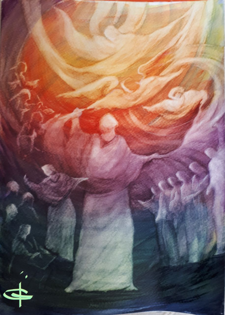¡Piensen en todos ellos! Los grandes maestros de Chartres participaron. Ellos, como saben por mis últimas descripciones, aún no han vuelto a bajar, pero enviaron antes que ellos a aquellos que trabajaron sobre todo en la Orden Dominicana, habiendo celebrado una especie de conferencia con ellos a finales de los siglos XII y XIII. Todas estas almas se reunieron después de nuevo: aquellas que con labios ardientes habían proclamado las enseñanzas antiguas y sagradas de la Escuela de Chartres, y aquellas que habían luchado en las frías y claras, pero devotas obras de la Escolástica, para dominar el verdadero significado de la Inteligencia. Todas ellas se encontraban entre las huestes de Micael, aprendiendo las lecciones de la Escuela que he indicado.