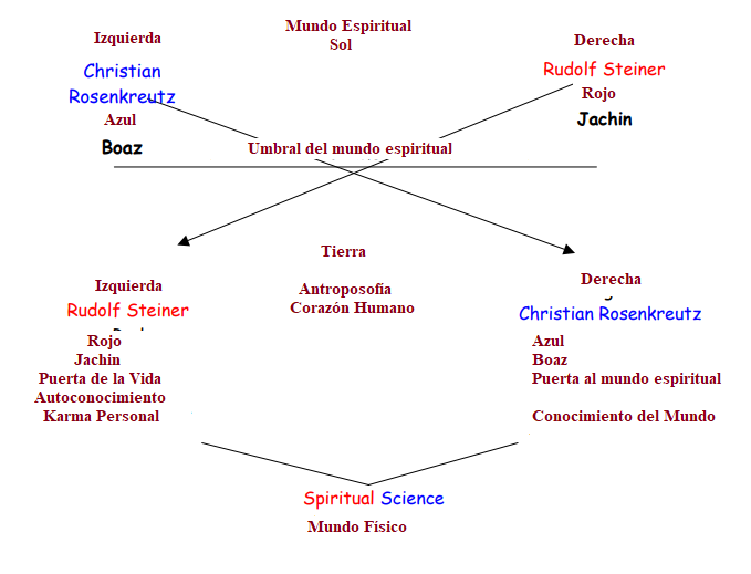 Piensen en un altar suprasensible en el mundo espiritual. Junto a él, a la izquierda, está Christian Rosenkreutz con una estola azul, y a la derecha está Rudolf Steiner con una estola roja. (Vea el diagrama a continuación)
