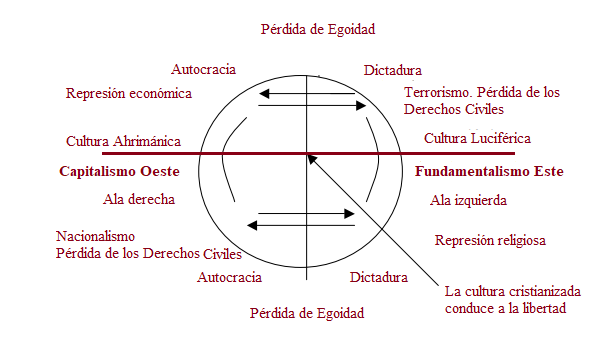 Mi talentoso hijo escribió recientemente una tesis en la que llegó a la conclusión de que los gobiernos pueden utilizar ideales que son exteriormente opuestos a su propia ideología para crear una base de poder. En este modelo, un capitalista puede utilizar el terrorismo para asegurar un liderazgo autocrático y viceversa. En este caso, tanto el capitalismo económico (Occidente) como el fundamentalismo religioso (Oriente) comienzan en extremos opuestos del espectro, pero a medida que se van desplazando cada vez más hacia el extremo, uno u otro, conducen a una y la misma cosa, la autocracia y la dictadura. Cada vez que se necesita una revolución, una guerra o una amenaza para crear una atmósfera de opresión, ya sea económica, social o religiosa. Si utilizamos este modelo en el contexto actual, cuando observamos las corrientes del Anti Grial, podemos ver cómo Oriente y Occidente llegan a la autocracia y la dictadura desde diferentes direcciones trabajando juntos, de manera similar a cómo las corrientes legítimas del Grial de Oriente y Occidente se unieron en el siglo IX. Estamos viendo ahora los frutos de la unificación de la corriente del Anti Grial en el evento del 11 de septiembre.
