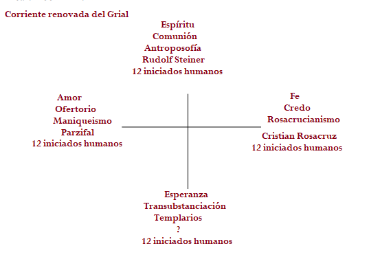 Existen ahora cuatro nuevas corrientes de misterio cuya tarea es la de custodiar y difundir el conocimiento del Grial, es decir, el conocimiento de la Conciencia Crística, recibido conscientemente por los seres humanos para que pueda renacer, es decir, la “recepción” de la misma mediante la cual el ser humano se convierte en un Cristo-dekteros.
