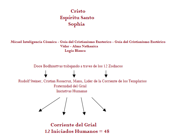 Como vemos arriba, cada corriente tiene 12 iniciados que trabajan bajo un gran guardián “humano” que trabaja desde la Hermandad del Grial. Esta Hermandad del Grial trabaja para impartir el secreto del Grial a los individuos, es decir, cómo el individuo debe preparar su recipiente para una comunión consciente con Cristo.