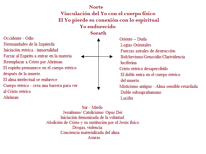 De Occidente vienen las Hermandades de Izquierda – los Francmasones – al menos algunas facciones de ellos, C.F.R (Central Foreign Relations), la Mesa Redonda, las Becas Cecil Rhodes, la Orden de la Calavera y los Huesos, y sus instrumentos políticos y económicos asociados – que buscan unir a tantos seres humanos como sea posible de una manera «inconsciente» con la vida material para que en la vida entre la muerte y el renacimiento los cuerpos Etéricos de esas almas no se disipen sino que permanezcan rodeando la tierra y puedan ser utilizados como instrumentos para estos grupos poderosos. Estos cuerpos Etéricos crean un obstáculo a la percepción del Ser del Cristo Etérico. Estas hermandades occidentales trabajan particularmente en la vida económica porque esta es una excelente manera de vincular a la humanidad con la materia. Los iniciados en esta corriente también buscan permanecer «conscientemente» en sus cuerpos etéricos después de la muerte como una especie de inmortalidad etérica.