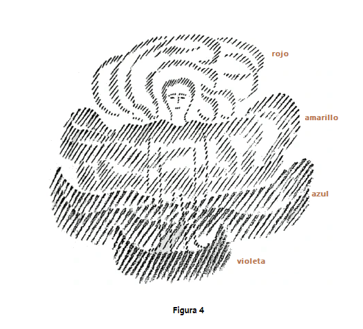 Así que, como veis, si queremos hablar de este árbol de las Sephiroth, tenemos que considerar al ser humano. Los antiguos hebreos llamaban a las diez Sephiroth juntas: keter chokmah, binah, chesed, geburah, tiphereth, netsah, hod, Jesod, malkuth. Estas diez fuerzas son la conexión real entre el hombre y el mundo espiritual superior, aunque la décima fuerza, malkuth, está situada dentro de la Tierra. Básicamente, por tanto, tenemos aquí al ser humano físico (señalando el dibujo) y a su alrededor está el ser humano espiritual, en primer lugar, abajo, como las fuerzas de la tierra, y luego como fuerzas que se acercan a la tierra, pero actúan desde el entorno: netsah, hod, jesod. Espiritualmente, la forma en que estas fuerzas le influyen es parte del ser humano. Luego están las fuerzas que actúan sobre su circulación sanguínea y su respiración: chesed, geburah, tiphereth. Y luego, los poderes más nobles que influyen en el ser humano, actuando sobre su sistema cerebral: keter, chokmah, binah. De modo que los judíos realmente veían al ser humano conectado con el mundo en todas las direcciones, como lo he mostrado aquí en color [Fig. 4]. El hombre realmente está hecho de tal manera que también tiene aspectos suprasensibles. Y ellos veían estos aspectos suprasensibles de esta manera.