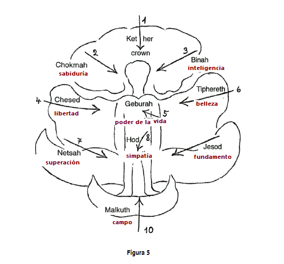Y esta cabeza humana necesitaba también otras dos fuerzas. Estas dos fuerzas le llegaban por la derecha y por la izquierda. Los antiguos pensaban que la más alta venía de arriba, y las otras dos fuerzas, dos fuerzas cósmicas que están presentes en todo el universo, venían por la derecha y por la izquierda. La que entraba por el oído derecho, por así decirlo, se llamaba chokmah, sabiduría. Si quisiéramos traducir la palabra hoy diríamos ‘sabiduría’. Y por otro lado, binah entraba desde el universo. A esto hoy lo llamaríamos inteligencia (2 y 3 en la Fig. 5). Los judíos antiguos distinguían entre sabiduría e inteligencia. Hoy en día, cualquier persona inteligente también se considera sabia. Pero ese no es el caso. Se puede ser inteligente y pensar las cosas más tontas. Las cosas más tontas se piensan de las formas más inteligentes hoy en día. Por lo tanto, si observamos muchas cosas en la ciencia moderna, tenemos que decir que es realmente inteligente en todos los aspectos, pero definitivamente no es sabia. Los judíos antiguos distinguían entre chokmah y binah, la sabiduría e inteligencia de la antigüedad.