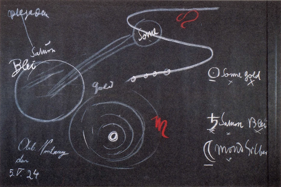 Así pues, para cada planeta hay un metal. Los babilonios y los asirios utilizaban este signo para el sol: ☉. Y también utilizaban este signo para el oro. Sabían, por tanto, que ahora que tenemos la Tierra, los astros ya no influyen en los minerales, pero sí lo hacían en el pasado. Escribían el sol y el oro así: ☉. Tampoco escribían «plomo», sino que utilizaban el signo: ♄, que significa tanto Saturno como plomo. Nadie hubiera soñado con escribir «Saturno» o «plomo» con letras comunes en aquellos tiempos antiguos. Si querían escribirlo, ponían este signo: ☽. Para escribir «plata» ponían este signo: ☽. Significaba tanto luna como plata. Así pues, la Tierra, en cuanto metálica, también se veía en relación con las estrellas.