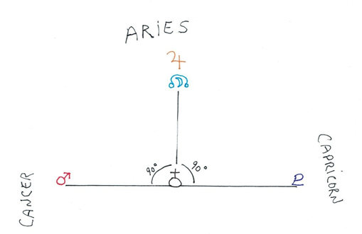 Una cuadratura es un aspecto de “Marte”, que generalmente significa una relación conflictiva o desafiante que necesita una resolución. Una cuadratura en T es como una cuadratura doble, un desafío más intenso que puede ser muy volátil pero que también puede conducir a un progreso real si se lo comprende y se lo resuelve conscientemente. La conciencia, y en este caso una conciencia espiritual superior que porta Júpiter, es la clave. En la cuadratura en T, el planeta que está en doble cuadratura, Júpiter, es el foco del desafío y la fuente de la resolución. Júpiter es el planeta, no en oposición, sino el objeto del cuadrado doble, por lo que en cierto sentido se podría decir que Júpiter puede convertirse en el héroe en esta batalla. ¿Cómo podemos penetrar en las cualidades y desafíos más profundos de esta configuración? Quizás muchos de ustedes que están estudiando astrosofía ya puedan tener sus propias ideas sobre este panorama. Por supuesto, hay muchas dimensiones de comprensión aquí, pero podemos centrarnos en lo que parece sobresaliente en esta dinámica particular.