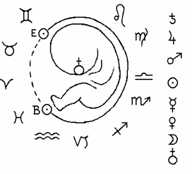 En el dibujo, hemos utilizado la posición geocéntrica, ya que los eventos celestiales están relacionados con el desarrollo embrionario. Aquí notamos que el Sol se mueve a través de tres cuartas partes de la eclíptica durante el desarrollo embrionario. También notamos el orden natural de los planetas a la derecha. Es raro que se encuentren en una relación exacta en los cielos, aunque casi así fue en 1962. Podemos ver la división entre los planetas exteriores Saturno, Júpiter y Marte y los planetas interiores Mercurio, Venus y la Luna, que se interponen entre el Sol y la Tierra. Podemos relacionar esto directamente con el desarrollo embrionario.