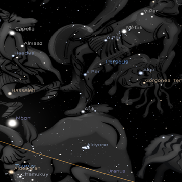 Como estudiantes de astrosofía, podemos empezar a trabajar con nuestro propio pensamiento cósmico y conocimiento de estas esferas planetarias para llegar a comprender mejor estas relaciones. Primero, podemos observar la estrella Algol. En la imagen de abajo se puede ver a Perseo sosteniendo la cabeza de Medusa en su mano izquierda, con la estrella Algol como el ojo de Medusa. Directamente debajo, cerca de la parte inferior de la imagen, se ve a Urano. La historia de Perseo es una historia de la conciencia humana cambiante en los tiempos griegos, cuando el héroe, Perseo, una especie de figura micaélica, conquista a las bestias de la conciencia pasada y viene a rescatar a la princesa Andrómeda, que representa el alma humana, de las fuerzas ahora dañinas de la conciencia atávica del pasado, representada por Cetus, el monstruo marino que estaba a punto de devorar a Andrómeda. Lo hace, se podría decir, utilizando a Ahriman contra Lucifer. La mirada de Medusa convertía a todas las criaturas en piedra, el intelecto frío y mortífero que una vez había sido el cabello de «serpientes» de sabiduría de Medusa, ahora convertía a todo ser viviente en piedra. Perseo dirigió la mirada de la Medusa hacia Cetus, que representaba la antigua conciencia atávica lunar acuosa, y lo petrificó, salvando así el alma. De ese rescate surge, como se muestra en los cielos sobre Piscis, la inteligencia alada, el caballo Pegaso. Estas constelaciones se extienden desde arriba de Tauro hasta arriba de Piscis. Esta es una poderosa y hermosa imaginación de la conciencia cambiante hacia la era de Aries que también apunta a la nueva conciencia «alada», la conciencia espiritual que debemos desarrollar en nuestro tiempo de Piscis y en la nueva era. Algol, que se llamaba la Estrella del Demonio o el Demonio Parpadeante, proviene del nombre árabe Ra’s al Ghul, la Cabeza del Demonio. Al Ghul, de donde obtenemos nuestra palabra ghoul, significa literalmente un Hacedor de Revoltijos. Se lo conoce en astronomía como un binario eclipsante, lo que significa que hay dos estrellas que se eclipsan entre sí cada pocos días, causando una especie de efecto de parpadeo. Esta Estrella Demonio ‘parpadea’ durante aproximadamente 8 horas mientras la estrella más tenue del par pasa entre la estrella más brillante y la Tierra.