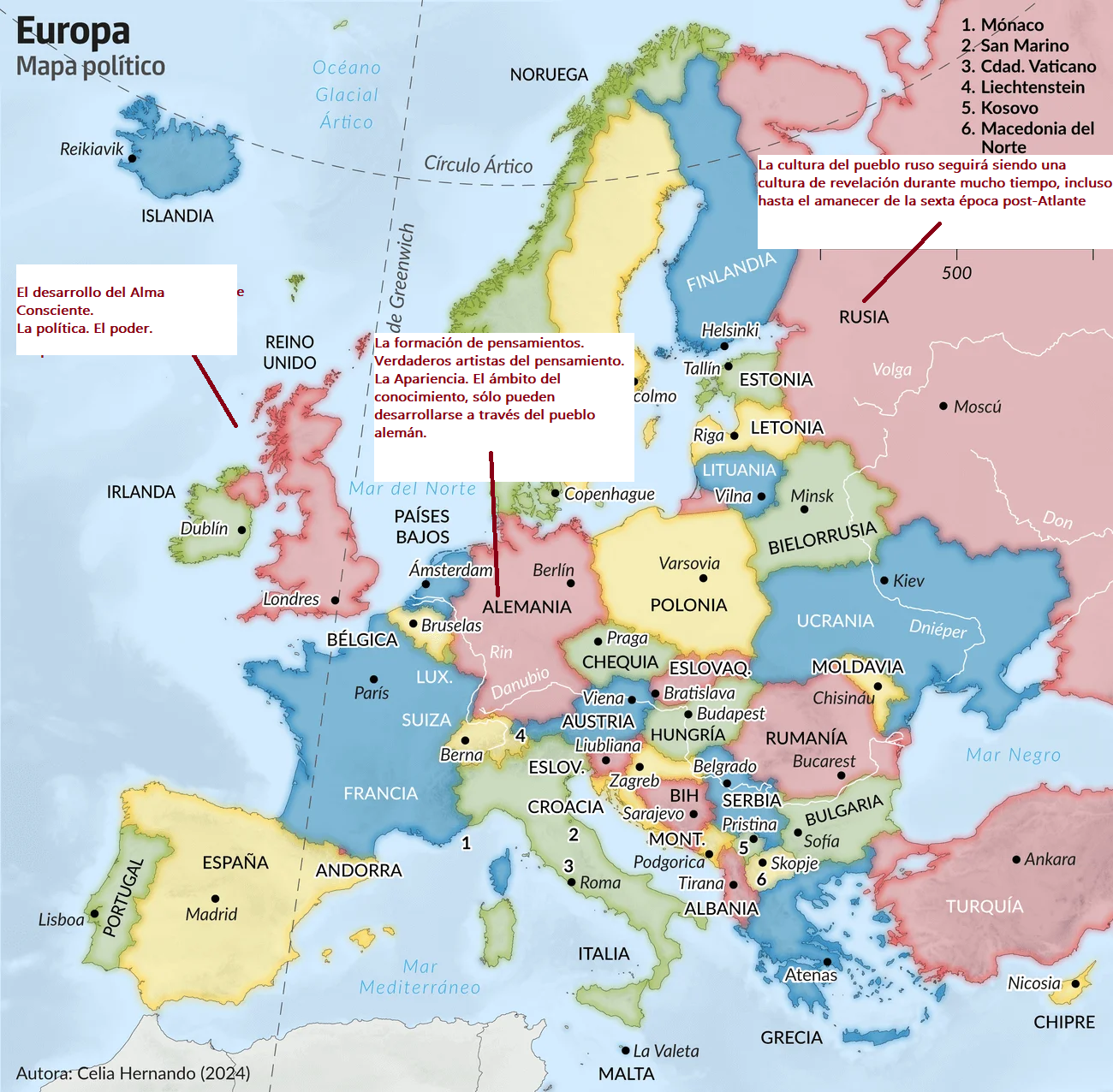 El pueblo de habla inglesa simplemente se guía a través de su política hacia aquello para lo que está dotado por la naturaleza. El pueblo de habla alemana se ve arrastrado por su política a algo que en realidad no le pertenece, algo por lo que fácilmente se deja llevar por un camino oscuro, por la falsedad, sobre todo cuando se deja llevar por sus instintos. Sin embargo, esto nunca les sucede a las personas que tienen la debida educación y aspiran a la intelectualidad. Ellos representan realmente al pueblo alemán. Los demás simplemente no han llegado a lo que constituye la verdadera naturaleza del pueblo alemán y viven por debajo de ese nivel. Esto es aún más cierto en el caso del pueblo ruso. El pueblo ruso no sólo es apolítico como los alemanes, sino antipolítico. Es por eso que la política británica será egoísta y la política alemana se convertirá en un idealismo soñador, que puede no tener nada que ver con la realidad. No hablo en un sentido moral, pero este idealismo soñador está relacionado con todo lo falso y teórico, y todo lo que proviene de la teorización es falso. La política rusa debe ser completamente falsa, ya que es un elemento extraño y no pertenece al carácter ruso. Cuando el ruso quiere convertirse en político en base a su carácter, es más probable que enferme. Entre el pueblo ruso, convertirse en «político» significa «enfermarse», es decir, introducir en sí mismo fuerzas destructivas. El ruso es antipolítico, no simplemente apolítico. Puede verse dominado por políticos como los que estaban en el poder al comienzo de esta catástrofe bélica, pero éstos no trabajan como rusos, sino como algo completamente diferente. El ruso, en cambio, se enferma cuando se espera que se convierta en político, porque no tiene nada que ver con la política si se mantiene dentro de su propio carácter popular. Tiene que ver con algo diferente. Tiene que ver con lo que constituye el tercer elemento en el sentido del cuento de hadas de Goethe, es decir, con el conocimiento y la sabiduría que ha de amanecer sobre la humanidad durante la sexta época post-Atlante.