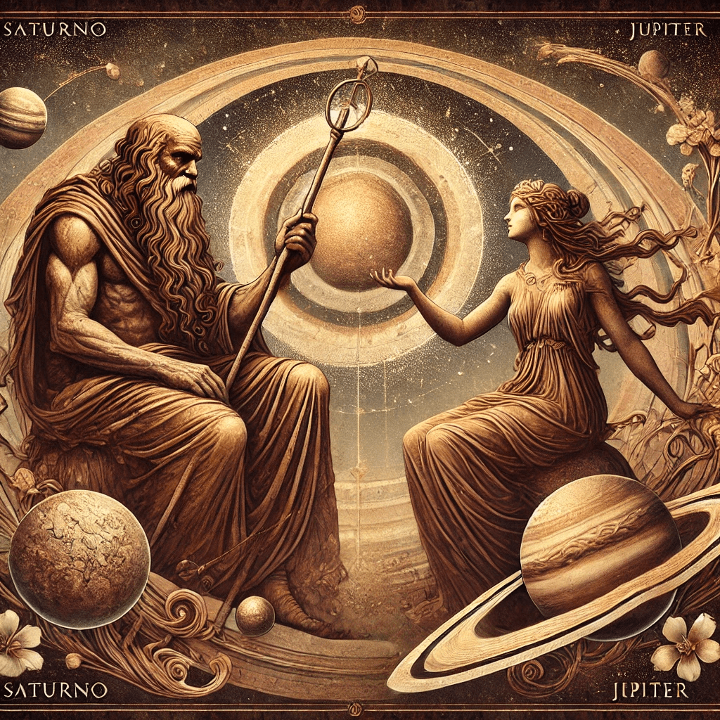 Erase una vez, en un mundo antiguo, cuando la Tierra aún no estaba del todo formada y los cielos eran un vasto lienzo donde ritmicamente se reunían las estrellas, existían dos esferas cósmicas que regían las fuerzas de la humanidad: la Esfera Saturnina, severa y firme, y la Esfera Jupiterina, expansiva y luminosa. Estas esferas no eran simples cuerpos celestes; eran reinos vivos, cada uno gobernado por un espíritu poderoso que representaba sus principios.