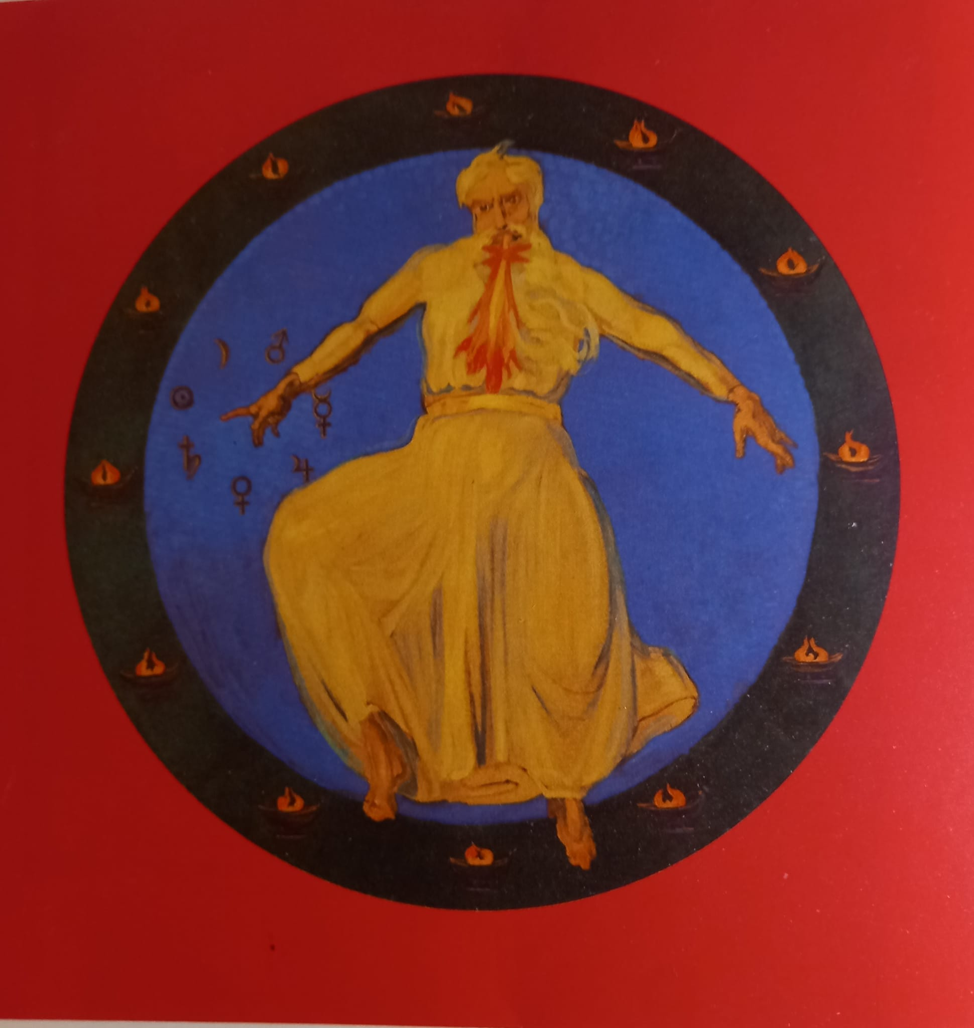 Esta segunda imaginación se encuentra también en el libro del Apocalipsis. Juan lo describe en el primer capítulo como la visión cósmica del Hijo del Hombre sosteniendo «en su diestra las siete estrellas», cuyo rostro era «como el Sol brillando en toda su fuerza», y «de cuya boca salía una aguda espada de dos filos» (véase figura 2). Solo si en el futuro esta sublime imaginación se experimenta y se convierte gradualmente en realidad interior, el hombre se transformará de tal manera que las fuerzas del Espíritu-Sol resplandecerán dentro del cuerpo astral purificado.