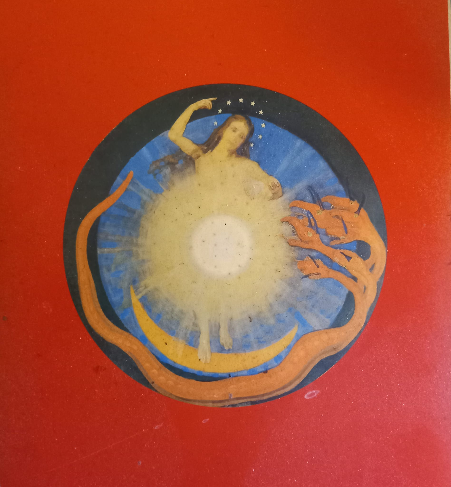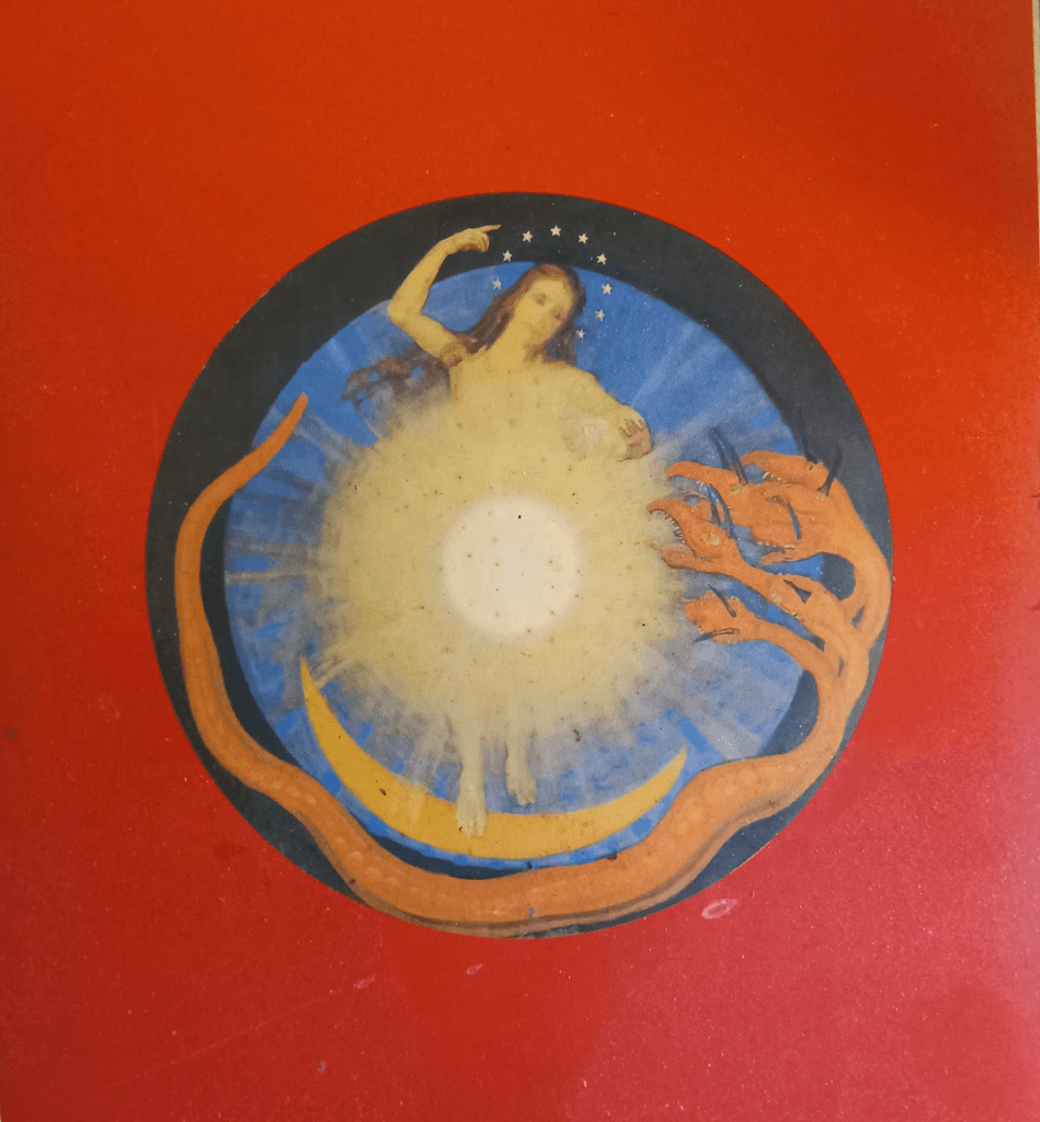 Esta es la imaginación de la Virgen cósmica (véase figura 1) vestida del Sol, con la Luna a sus pies y una corona de doce estrellas sobre su cabeza. En esta imaginación podemos discernir cierto aspecto de la Divina Sofía, dando origen a la vida solar superior que recibió del Verbo divino o Logos Cósmico: a través de ella contemplamos la fructificación de Sofía por el Espíritu del Mundo, quien invoca el nacimiento en nuestro mundo de un nuevo Ser Solar.