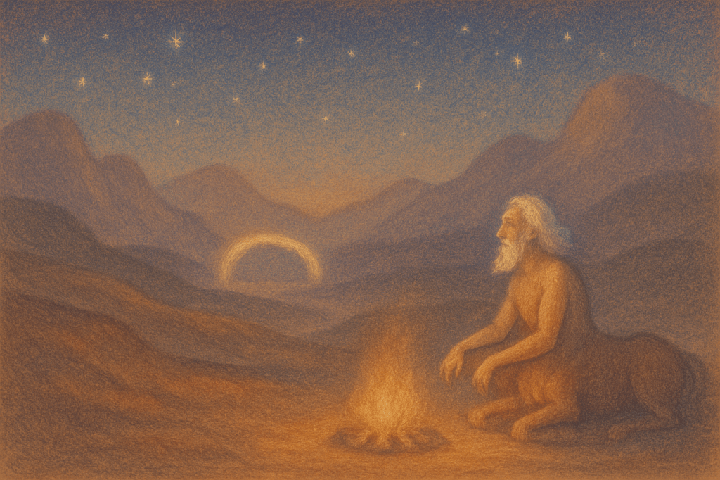 En el centro del valle se alzaba una figura solitaria, mitad animal, mitad luz. Una mónada. Su nombre era Quirón. Su mirada atravesaba el horizonte de los mundos, como si recordara estrellas ya extinguidas y futuros aún no nacidos.