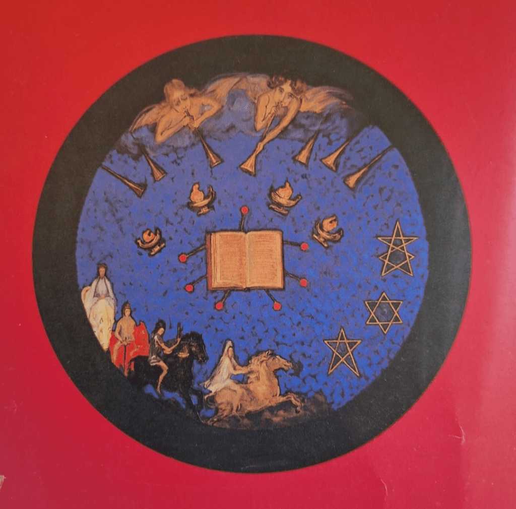 Por lo tanto, el alma aún se encontraba en el plano astral; y podemos remontarnos aún más atrás, a cuando el alma humana existía en el nivel espiritual, en el Devacán. En el futuro, el alma ascenderá de nuevo a esta etapa elevada, después de haber sido purificada por vidas en la Tierra. Así, desde el nivel espiritual, pasando por el astral, luego al plano físico y luego de vuelta al espiritual: ese es el largo camino evolutivo del ser humano. Y, sin embargo, todo esto parece ser de corta duración si se compara con el tiempo evolutivo que la humanidad experimentó en el Eón de Saturno y los demás eones. En estos eones remotos, el ser humano experimentó no solo transformaciones físicas, sino también espirituales y astrales, además de físicas. Y si uno busca investigar estas transformaciones y seguirlas en visión, entonces debe (como vidente) ascender a los reinos superiores. Allí escucha la Música de las Esferas: tonos que fluyen por el espacio (es decir, el entorno que lo rodea). Y si el ser humano ha de volver a vivir en este reino espiritual, entonces la Música de las Esferas resonará en él o ella. Esta experiencia se denomina en el esoterismo «el llamado de trompeta de los Ángeles». Por esta razón, el tercer sello incluye las trompetas. De los mundos espirituales provienen las revelaciones, pero estas solo revelan su verdadero significado a la persona cuando ha avanzado más en el camino. En ese momento, el libro, con sus siete sellos de lacre abiertos, se manifiesta al estudiante; los sellos de lacre revelan su significado. Son precisamente estos sellos de lacre abiertos los que vemos desplegados alrededor del libro abierto. Debido a este proceso, el libro se sitúa en el centro de la imagen, mientras que debajo se representan cuatro fases principales de la evolución de la humanidad. Los cuatro jinetes representan, en realidad, las fases de desarrollo que la humanidad debe atravesar.