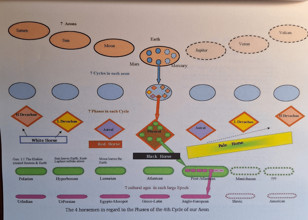 Así pues, desde el nivel espiritual, pasando por el astral y finalmente por el plano físico, esto parece referirse a las «fases» de un «ciclo» de evolución en nuestro Eón Terrestre. El diagrama del Apéndice Uno (véase más abajo) muestra cómo cada ciclo de evolución consta de siete fases: por lo tanto, las observaciones de Rudolf Steiner, que son solo breves comentarios generales, se refieren a las primeras cuatro fases del cuarto ciclo del Eón Terrestre. Las primeras fases ocurren en el Devacán, luego nuestro sistema solar desciende al nivel astral en la fase 3, y luego, en la cuarta fase, la evolución entra en el nivel material y físico (el caballo negro). Luego de eso, la dinámica se invierte y el sistema solar avanza hacia los reinos espirituales.