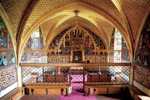 Lo que impresiona de inmediato al visitar el castillo es la decoración interior. Los adornos de las paredes de las diversas capillas, con su abundancia de piedras semipreciosas y oro, y la forma en que la luz se difunde a través de estas piedras semipreciosas, engastadas en plomo dorado, que sustituyen a los cristales de las ventanas, llevan a la conclusión de que Carlos IV conocía el poder de las piedras preciosas y del oro.