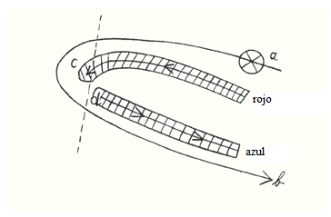 Verán, este nervio que señalé en rojo nos sitúa en el mundo físico, para que podamos experimentar sensaciones en él. El otro nervio, en azul, nos permite sentirnos como cuerpo. No hay diferencia esencial entre experimentar un color conscientemente desde fuera, a través del cordón nervioso a c, y un órgano, o su posición, desde dentro, a través del cordón d b; en esencia, es lo mismo. En un caso, experimentamos que algo físico está dentro de nosotros, es decir, encerrado en nuestra piel. No solo lo externo, sino también lo interno, nos introduce en el proceso que puede experimentarse como un proceso volitivo. La intensidad de la percepción varía según el cordón nervioso que la transmite: el cordón a c o el cordón d b. De hecho, se produce una clara disminución de la intensidad. Cuando una idea se vincula con un impulso volitivo en a, el impulso se transmite desde a; Cuando salta de c a d, todo el proceso se debilita tanto en nuestra consciencia o experiencia que experimentamos su continuación —por ejemplo, al levantar la mano— solo con la leve intensidad de consciencia que poseemos durante el sueño. Al levantar la mano, volvemos a percibir la voluntad, pero en forma de una nueva sensación desde otro lado. El sueño se extiende continuamente, anatómica y fisiológicamente, a nuestra vida de vigilia. Estamos conectados con el mundo físico exterior, pero estamos completamente despiertos solo con esa parte de nuestro ser que llega hasta la interrupción de los nervios. Lo que reside en nosotros más allá de esta interrupción nerviosa está envuelto en el sueño, incluso de día. En la etapa actual de la evolución de la Tierra, este proceso aún no es físico; tiene lugar en cierto nivel espiritual, aunque está conectado en gran medida con las cualidades inferiores de la naturaleza humana. Sin embargo, he expuesto a menudo el secreto de que precisamente la «naturaleza inferior» del hombre está conectada con las manifestaciones superiores de ciertos seres espirituales. Si observamos todos los puntos del ser humano donde se interrumpen los nervios y los anotamos en un diagrama, obtenemos la línea divisoria entre la experiencia en el mundo físico y la experiencia que proviene de un mundo superior. Por lo tanto, puedo usar el siguiente diagrama: Supongamos que indico aquí todas las interrupciones nerviosas: aquí está la cabeza y aquí una pierna. Ahora supongamos que una supuesta impresión sale de aquí y que la interrupción del nervio está en este punto. El resultado será «caminar», y el verdadero proceso consiste en que todo lo que experimentamos a través del nervio aquí, lo experimentamos durante el día en estado de vigilia. Pero lo que experimentamos aquí como voluntad inconsciente lo experimentamos durante el sueño, incluso despiertos. El mundo espiritual forma y crea directamente todo lo que se encuentra por debajo del punto de interrupción de los nervios.