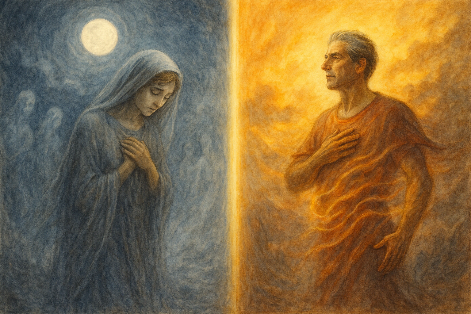 Cuando hablamos de sentir vergüenza y el rubor sube a nuestro rostro, experimentamos algo que recuerda al estado lunar. Imaginen a un hombre de la época lunar. Aún no podía decirse “yo”, sino que vivía en una conciencia de imágenes apagada, crepuscular, inmerso en fuerzas y seres anímico-espirituales con los cuales se sentía uno, en armonía. Imaginen, hermanas y hermanos, que un día en tal hombre lunar surgiera repentinamente el sentimiento: “Soy un ‘yo’. Soy diferente de los demás, soy un ser independiente, y todos los demás seres en mi entorno me miran.” —Todo el hombre lunar habría brillado de arriba abajo con un sentimiento de vergüenza enormemente intenso; habría querido desaparecer, hundirse de vergüenza, si hubiera podido sentir un sentimiento de individualidad tan prematuro. Así también nosotros, hermanas y hermanos, cuando nos embarga un sentimiento de vergüenza, quisiéramos desaparecer, hundirnos bajo tierra, disolver nuestro ‘yo’, por así decirlo. Imaginen cómo el antiguo hombre lunar estaba inmerso en armonía con las fuerzas y seres de su entorno. Cuando se acercaba a él un ser enemigo, no pensaba, sino que sabía instintivamente cómo evitarlo. Actuaba dentro de un sentimiento que, si hubiera sido consciente, podría haber expresado así: “Sé que la legalidad del mundo no está organizada de tal manera que esta bestia salvaje me destroce ahora, sino que la armonía del mundo es tal que ella me protege de mi enemigo.”
