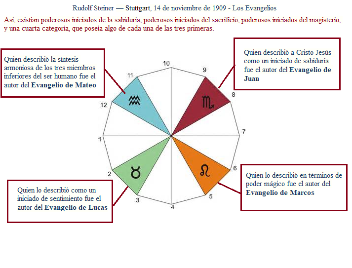 Así, hemos descrito a Cristo Jesús segun cuatro iniciados. Quien lo describió como un iniciado de sabiduría fue el autor del Evangelio de Juan; quien lo describió como un iniciado de sentimiento fue el autor del Evangelio de Lucas; quien lo describió en términos de poder mágico fue el autor del Evangelio de Marcos; y quien describió la síntesis armoniosa de los tres miembros inferiores del ser humano fue el autor del Evangelio de Mateo. Así, cada uno describió aquello en Cristo Jesús en lo que fue iniciado.