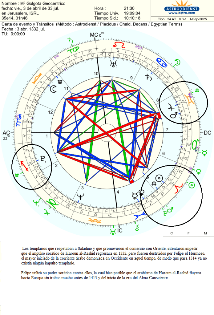 Los templarios que respetaban a Saladino y que promovieron el comercio con Oriente, intentaron impedir que el impulso sorático de Haroun al-Rashid regresara en 1332, pero fueron destruidos por Felipe el Hermoso, el mayor iniciado de la corriente árabe demoníaca en Occidente en aquel tiempo, de modo que para 1314 ya no existía ningún impulso templario.