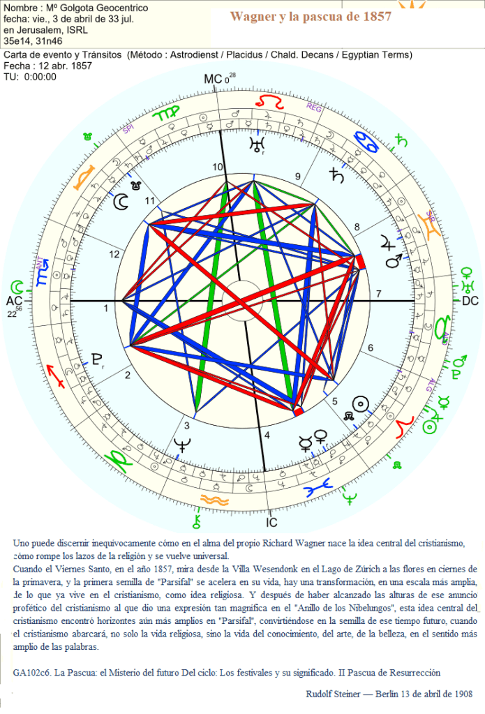 Uno puede discernir inequívocamente cómo en el alma del propio Richard Wagner nace la idea central del cristianismo, cómo rompe los lazos de la religión y se vuelve universal. Cuando el Viernes Santo, en el año 1857, mira desde la Villa Wesendonk en el Lago de Zúrich a las flores en ciernes de la primavera, y la primera semilla de «Parsifal» se acelera en su vida, esta es una transformación, en una escala más amplia, de lo que ya vive en el cristianismo, como idea religiosa. Y después de haber alcanzado las alturas de ese anuncio profético del cristianismo al que dio una expresión tan magnífica en el «Anillo de los Nibelungos», esta idea central del cristianismo encontró horizontes aún más amplios en «Parsifal», convirtiéndose en la semilla de ese tiempo futuro, cuando el cristianismo abarcará, no solo la vida religiosa, sino la vida del conocimiento, del arte, de la belleza, en el sentido más amplio de la palabra.
