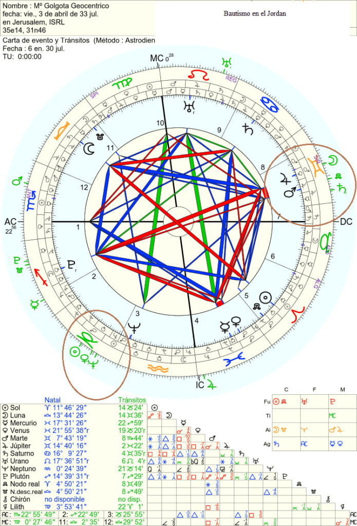 En ese tiempo, también estaba el ritmo menor del planeta Saturno, que se mueve a través del Zodíaco en la dirección opuesta al punto vernal. Toma un poco menos de 30 años completos moverse a través del Zodíaco. En este tiempo de los Eventos de Palestina, Saturno estaba en la constelación de Géminis. Jesús fue bautizado a la edad de 30 años. La fecha tradicional de su nacimiento sigue siendo correcta, y tenía 30 años para la Navidad del 30 d.C. Su Bautismo fue el 6 de enero del año 31 d.C., cuando Saturno estaba en la constelación de los Gemelos. Celebramos el nacimiento de Jesús el 25 de diciembre, y el nacimiento de Juan el Bautista el 24 de junio, pues él nació seis meses antes de Jesús.