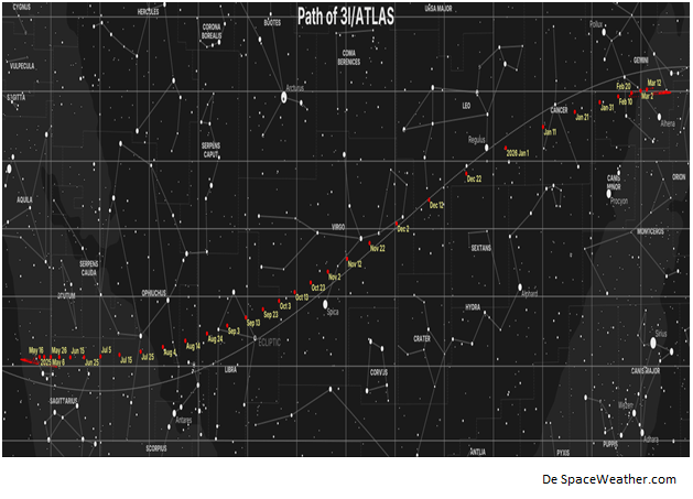 3I/Atlas entró en nuestro sistema solar el 21 de mayo de 2025, justo entre la punta de la flecha en el arco de Sagitario y las estrellas de la Serpiente en la constelación de Ofiuco, muy cerca del centro galáctico. Por lo tanto, su nacimiento en nuestro sistema solar tiene esta relación galáctica concreta. Su trayectoria recorre el zodíaco desde Sagitario hasta Géminis, de donde parte el 17 de abril de 2026. A continuación, se muestran dos mapas de la trayectoria del objeto. La primera imagen lo muestra cerca de Spica el 2 de noviembre (volveremos a esto más adelante) y luego pasando por Virgo y Leo, llegando a la estrella Regulus (el Corazón del León) en Navidad.