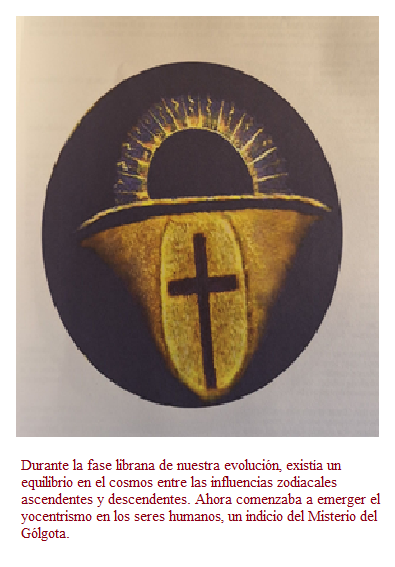Al finalizar esta época libriana, a mediados de la Era Atlante, alrededor del 15.000 a.C., las fuerzas espirituales se activaron para generar un sentido del yo más fuerte en los seres humanos. Desde la esfera solar, el Cristo Cósmico y otros de los Espíritus de la Forma (o Exusiai) irradiaron sus influencias sobre la humanidad. Este proceso se emprendió para asegurar que el sentido del yo, al consolidarse en la humanidad, retuviera una conexión inherente con el Yo Espiritual [y también con el Espíritu de Vida (Budhi) y el Hombre Espíritu (Atma)].