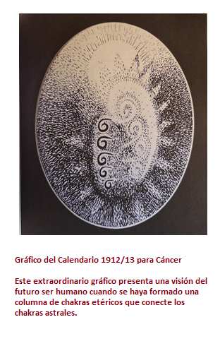 La siguiente imagen en el zodíaco de Stuttgart representa la estructura espiritual interna y el logro de la humanidad en la fase de Cáncer de nuestro futuro (ver ilustración abajo). La imagen seguiría siendo un enigma si Imma von Eckhardtstein no hubiera anotado que le dijeron que representa «el desarrollo de los chakras, y que aquí se está formando una radiante ‘columna vertebral hacia adelante’, y la columna vertebral actual desaparece». Así que la perspectiva aquí es como si uno mirara desde arriba a un ser humano, en una Era futura.