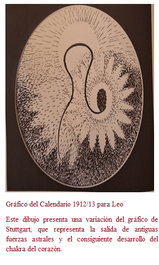 En el techo de Stuttgart, todas las imágenes posteriores a la de Virgo se refieren a fases futuras de la evolución humana. Por lo que notamos anteriormente, la fase de Leo y luego la fase de Cáncer ocurren durante la sexta Gran Época, la Época Maniquea. Rudolf Steiner mencionó que el gráfico de Leo concierne al desarrollo del chakra del corazón, y que la línea oscura que lo atraviesa es una imagen especular del símbolo tradicional de Leo (ver ilustración abajo). Así que este gráfico representa el área del corazón, con su chakra de 12 pétalos. Cuando este chakra se desarrolla, otorga la capacidad de percibir el calor o frío interno de otros seres, y de las fuerzas elementales en minerales y plantas. También otorga percepción del estado de ánimo o mentalidad de otras personas.