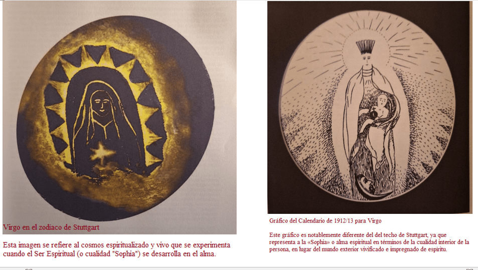 El símbolo de la fase de Virgo en el techo de Stuttgart es bastante llamativo y muy diferente del gráfico diseñado para el Calendario de 1912/13 (ver ambos abajo). En esta pintura vemos un entorno similar a una nube, dentro del cual hay un simple contorno de una figura femenina. Tiene similitudes con las representaciones de la Virgen María, pero también posee una cualidad cósmica, pues a su alrededor hay un aura radiante que se extiende en doce áreas. Esta figura sostiene lo que parece ser una paloma o un objeto similar al sol. Toda la imagen también se fusiona ligeramente con la siguiente, la de Leo. En las constelaciones zodiacales, las estrellas de Leo y Virgo se superponen ligeramente.