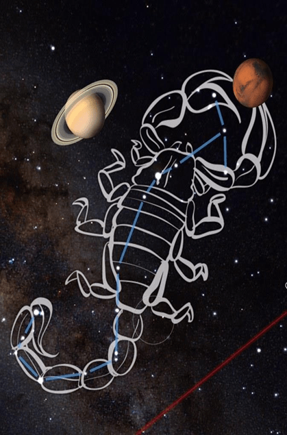 La imagen de esta semana es Saturno en Escorpio, muy cerca de la estrella Antares, el corazón de Escorpio. Marte se acerca y parece estar en las garras de Escorpio. Sin embargo, astronómicamente, todavía se encuentra en las estrellas fijas de Libra. En la antigüedad, Libra no existía, pero en nuestra época, tiene una importancia primordial. Sin embargo, este tema y el zodíaco detrás de los planetas nos desviarían del enfoque de hoy.