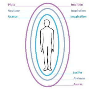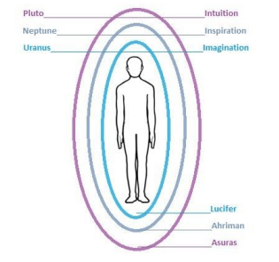 Sin embargo, toda luz tiene su sombra. La naturaleza caída de Urano pertenece a la esfera de Lucifer. Puede convertirse en un reino que puede ir en dos direcciones: perderse en imaginaciones personales, como fantasías, delirios e imágenes mediúmnicas que no promueven la libertad en la cognición espiritual, o puede convertirse en un encantamiento con las percepciones sensoriales, la creencia de que solo lo que experimentan los sentidos es válido. Para aquellos lectores con una base en Antroposofía, se puede ver en esta dirección luciférica la evolución de la Antigua Luna (véase Rudolf Steiner, Ciencia Oculta: Un Bosquejo).