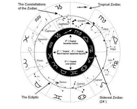 Debido al ligero bamboleo del eje de la Tierra al girar (piense en el movimiento de un trompo al tambalearse el punto de la parte superior), se crea un movimiento a lo largo del diámetro de la Tierra (el ecuador) y su relación con el plano de la eclíptica (la trayectoria del Sol a través del zodíaco). Este plano del ecuador extendido en el espacio intersecta el plano de la trayectoria del Sol en dos puntos, el punto de primavera y el punto de otoño. El punto de primavera marca el comienzo del signo de Aries. En un tiempo, en la época de Cristo, si uno mirara detrás del Sol a las estrellas reales en los cielos, habría visto las estrellas de Aries. Sin embargo, debido a este bamboleo de la Tierra, el punto de intersección que llamamos Equinoccio de Primavera se ha movido casi 30 grados hacia atrás a lo largo de las estrellas. De modo que ahora, si uno mirara detrás del Sol en primavera, no vería las estrellas de Aries… sino las estrellas de Piscis. Todo el círculo de los 12 signos del zodíaco se ha desplazado casi un signo completo hacia atrás, sólo las estrellas fijas del firmamento permanecen estacionarias.