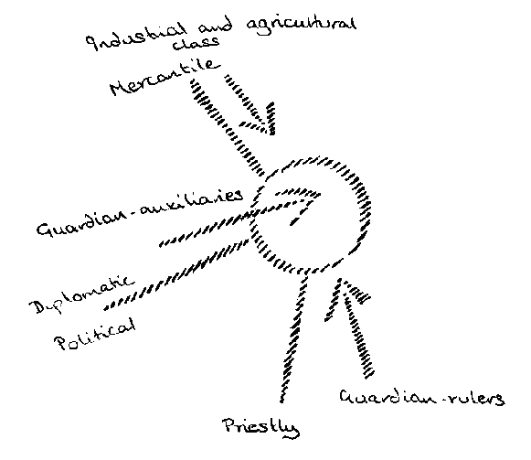 En un ámbito diferente, el elemento político y diplomático no es otra cosa que los «guardianes auxiliares» de Platón. Les he mostrado que, independientemente de lo que la gente llame militarismo prusiano, el verdadero elemento militar se formó teniendo a Francia como punto de partida, después de que se sentaran las primeras bases en Suiza. Ahí fue donde comenzó el elemento militar, pero por supuesto creó una oposición para sí mismo al retener a otros lo que consideraba su prerrogativa. Quiere dominar el mundo de manera militar, de modo que cuando algo militar le llega desde otro lugar lo encuentra bastante injustificado, tal como Roma lo encuentra injustificado si algo que tiene que ver con las grandes verdades del universo se le acerca.
