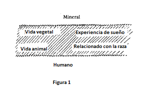 Los grandes maestros de los Misterios simplemente aceptaban esto como un hecho. Les mostraré gráficamente cómo pensaban al respecto. Se decían a sí mismos: «Las personas tienen una conciencia onírica mediante la cual perciben muy claramente la vida vegetal en su entorno». —En sus imágenes oníricas, estas personas ciertamente vivían con la vida vegetal; pero su conciencia onírica no se extendía a la comprensión del mundo mineral. Así que los maestros de los Misterios se decían: «La conciencia humana alcanza, por un lado, hasta la vida vegetal [ver dibujo], que se experimenta oníricamente, pero no hasta lo mineral; esto queda fuera de la conciencia humana. Y, por otro lado, los hombres sienten dentro de ellos aquello que aún los une con el mundo animal, es decir, lo relacionado con la raza, lo típico del animal. [Ver dibujo]. Por el contrario, lo que realmente hace humano al hombre, su forma erguida, la forma espacial de su ser, queda fuera de la conciencia humana».