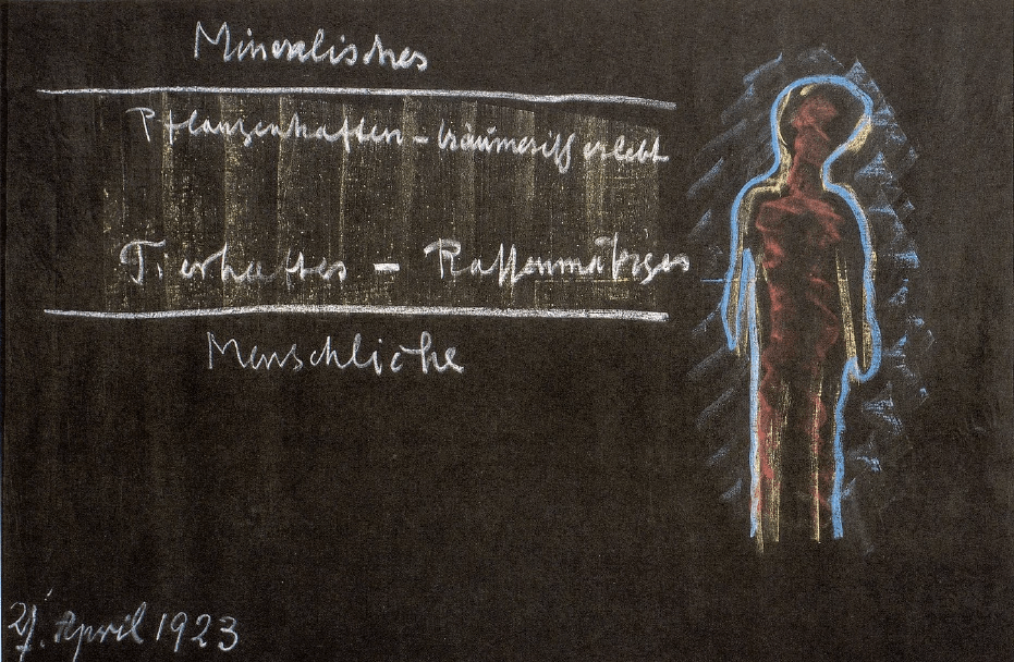 Hoy el hombre ha llegado tan lejos que sí nota su contorno, sus límites corporales. Percibe su contorno ciertamente como el rasgo típicamente humano de su forma (azul). Ahora, sin embargo, el hombre debe salir de sí mismo; debe aprender a conocer los elementos etéricos y astrales fuera de sí mismo. Esto solo puede hacerlo a través de la profundización de la ciencia espiritual.